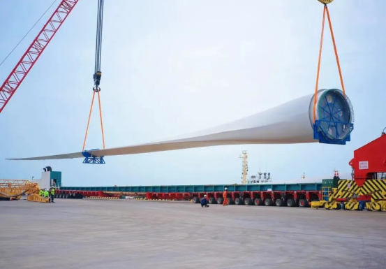 单支长度达153米的“叶片长龙”,长度堪比4架C919客机首尾相接,运输难度极高。从工厂到港口的运输路线如“障碍赛”,高压线、桥梁、急弯层层阻隔,发运团队提前半年实地勘测,多次复勘定制“分段式护送”方案。